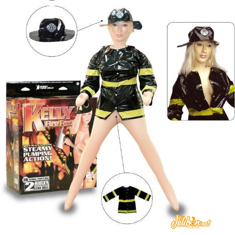 Çikarlabilir itfaiyeci kostümlü, 3 boyutlu yüze sahip, iri gögüslü, uzun gerçekçi saçli, anal ve vajinal iki islevli, sisme bebek.